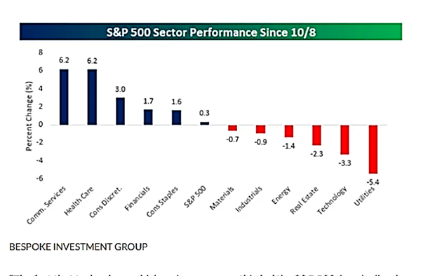 The internal market action matters more than the headlines. Technology, now nearly 35% of the S&P 500, is down roughly 3% over the past few months. (see chart) Yet the index held steady as other sectors stepped up. Staples, financials, discretionary, health care, and communication services have quietly carried the market. That tells us leadership is broadening beyond mega-cap tech and into the rest of the S&P 500, with international markets starting to participate as well.