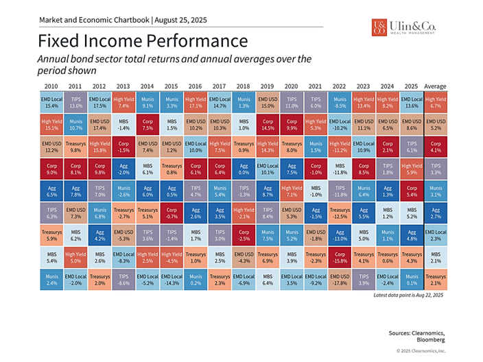 For five and a half years, bonds were the dead weight of the 60/40 portfolio. They offered no cushion, no juice. But 2025 is looking different. Fixed income has been one of the strongest asset classes year-to-date despite all the economic and tariff war uncertainty. (see chart below) Investment-grade corporates, municipals, even high yield are all showing gains upwards of 5%-6% ytd.